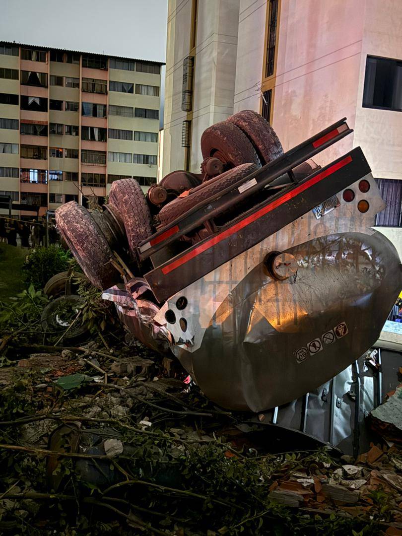 Luego, el camión tumbó la cerca perimetral del Conjunto Residencial Monseñor Chacón, impactó contra varios transformadores eléctricos y terminó con las ruedas arriba cerca de uno de los edificios del urbanismo.