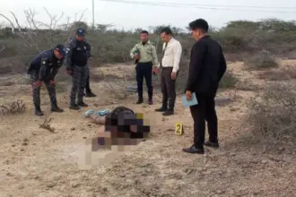 Un hombre de tez oscura, vestido con bermuda negra, camisa negra y botas azules, fue hallado muerto la…