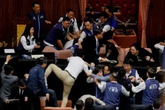 Los legisladores taiwaneses se empujaron, abordaron y golpearon en el parlamento este viernes en una amarga disputa sobre…