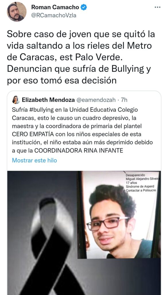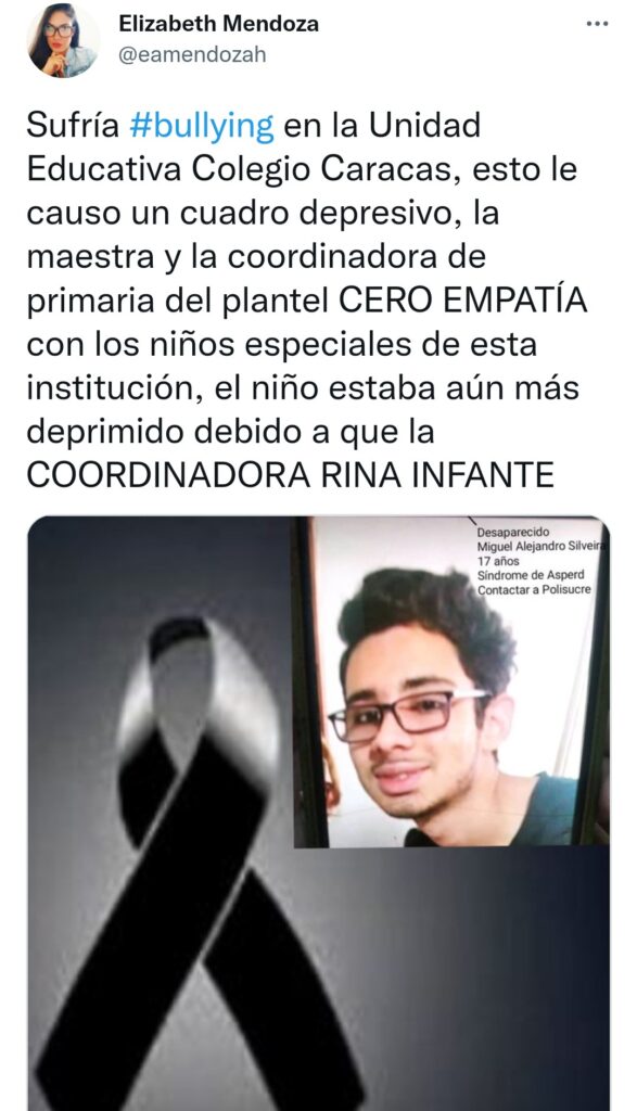 «Sufría bullying en la Unidad Educativa Colegio Caracas, esto le causó un cuadro depresivo», afirmó Elizabeth Mendoza, quien horas antes había pedido ayuda en la red social Twitter para encontrar al adolescente.
