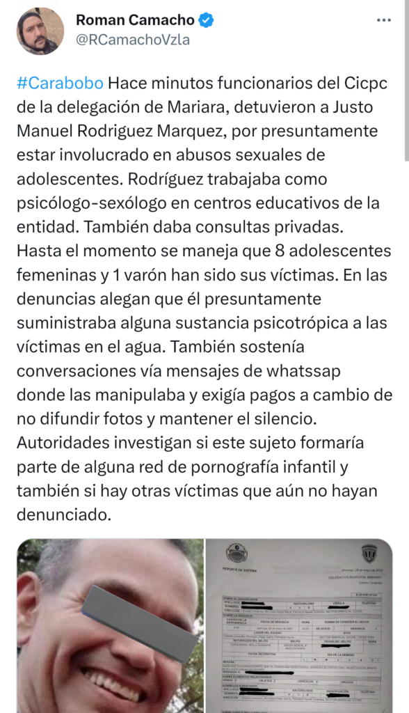 Funcionarios del CICPC de la delegación de Mariara, estado Carabobo, detuvieron este domingo al especialista Justo Manuel Rodríguez Márquez «por presuntamente estar involucrado en abusos sexuales de adolescentes», informó el periodista de sucesos Román Camacho en Twitter.