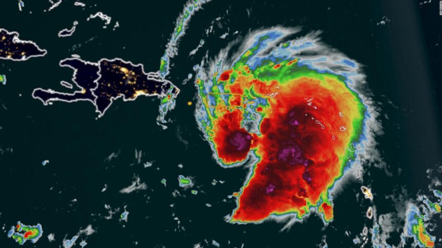 El domingo temprano, la tormenta tenía su centro 105 kilómetros (150 millas) al sureste de Ponce, Puerto Rico. Sus vientos sostenidos máximos eran de 110 kilómetros (70 millas) por hora y avanzaba hacia el oeste-noroeste a 13 kilómetros (8 millas) por hora.