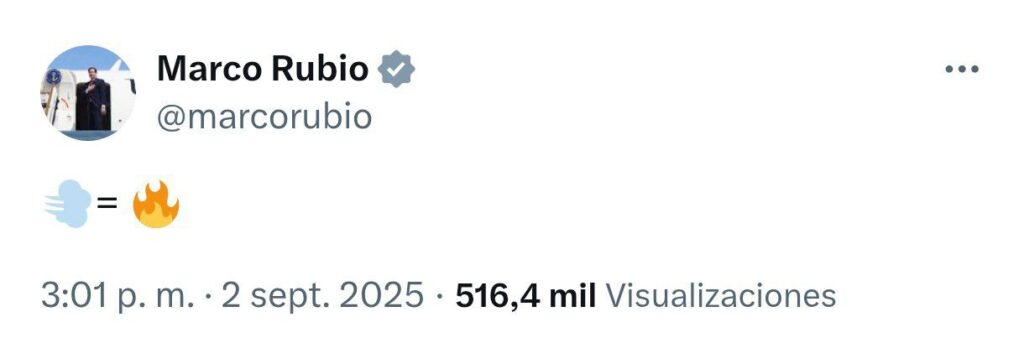 El tuit, publicado el 2 de septiembre de 2025 a las 3:01 p.m., muestra un emoji de humo, un símbolo de igual y un emoji de una llama de fuego, y fue difundido poco después de que el presidente Donald Trump anunciara un presunto ataque letal a una embarcación con drogas que, según él, habría salido de Venezuela.