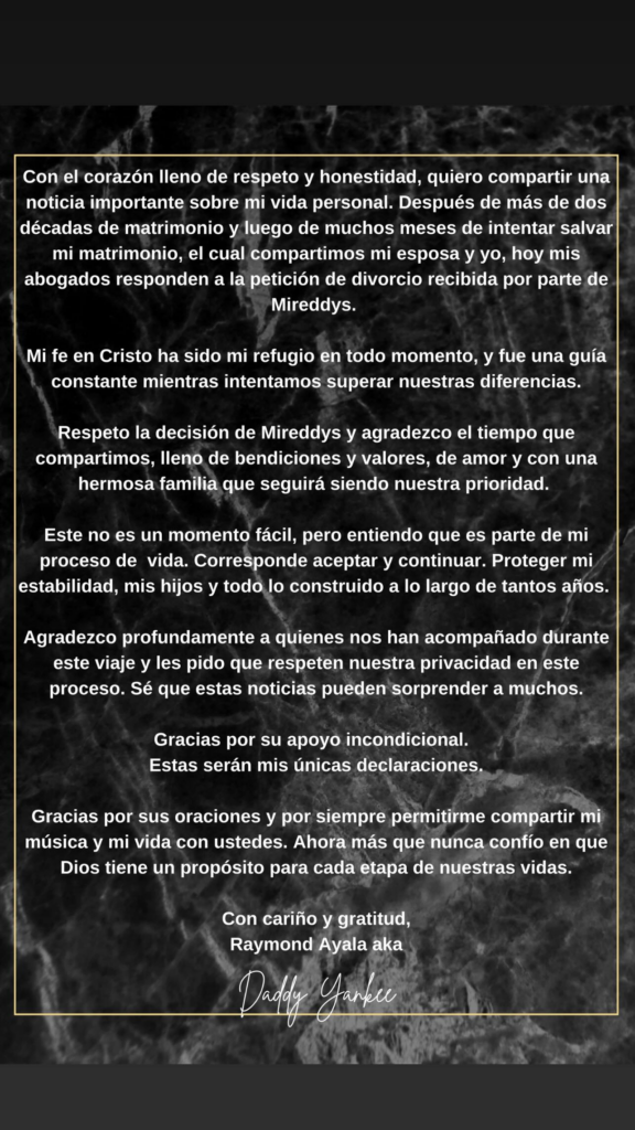«Después de más de dos décadas de matrimonio y luego de muchos meses de intentar salvar mi matrimonio, hoy mis abogados responden a la petición de divorcio recibida por parte de Mireddys», indicó Daddy Yankee.