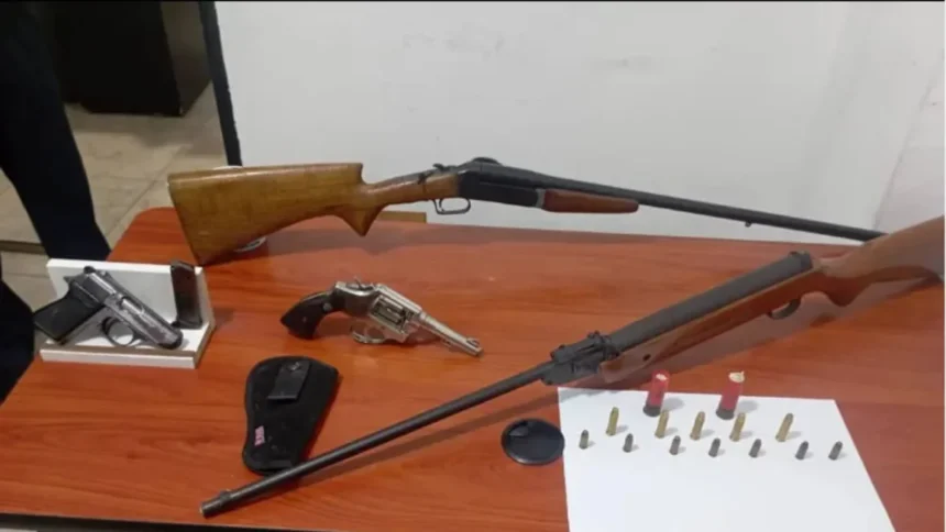 Tras la inspección en la habitación principal, localizaron en una gaveta un revólver con cinco cartuchos calibre 38 milímetros y una pistola calibre 7.65 con siete cartuchos.
