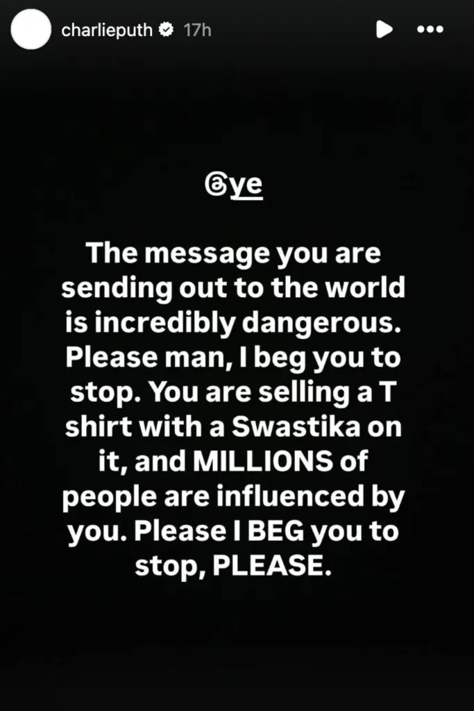 Tras ello, el cantante Charlie Puth recurrió a sus historias de Instagram para rogarle que deje de publicar “mensajes peligrosos”. A su vez, le pidió que frene la venta de camisetas con la esvástica nazi.