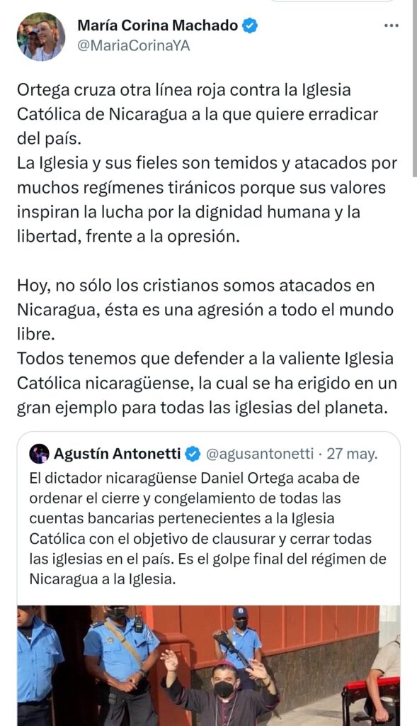 La precandidata presidencial María Corina Machado aseguró que el régimen de Daniel Ortega cruza otra línea roja contra la Iglesia Católica de Nicaragua tras congelar sus cuentas.
