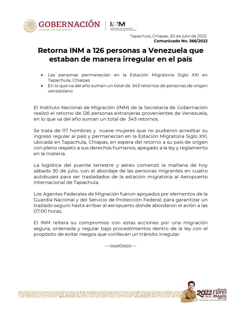 El INM añadió que durante este 2022 un total de 343 personas de origen venezolano que se encontraban en México de manera irregular han sido «retornadas» a su nación.