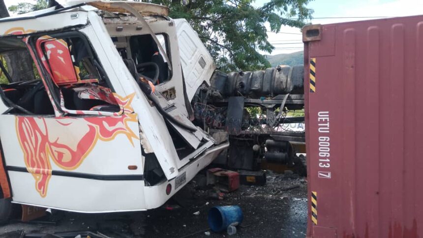 En el incidente quedaron involucrados un transporte tipo encava y un camión que trasladaba un container, ambos vehículos impactaron contra la barandilla de la vía luego de colisionar entre si.