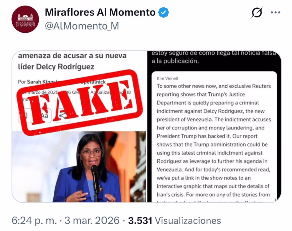 El gobierno de la presidenta interina de Venezuela, Delcy Rodríguez, reaccionó de forma tajante este martes 3 de marzo de 2026 ante el reporte de la agencia Reuters sobre una presunta acusación penal en su contra en Estados Unidos.