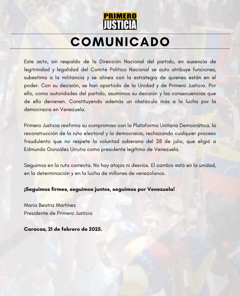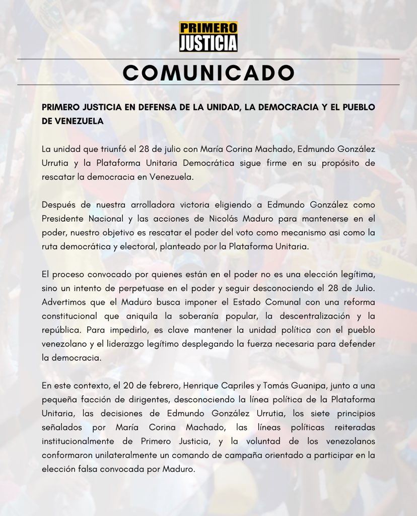 En un comunicado, Martínez explicó que «el 20 de febrero, Henrique Capriles y Tomás Guanipa, junto a una pequeña facción de dirigentes, desconociendo la línea política de la Plataforma Unitaria, las decisiones de Edmundo González Urrutia, los siete principios señalados por María Corina Machado, las líneas políticas reiteradas institucionalmente de Primero Justicia, y la voluntad de los venezolanos conformaron unilateralmente un comando de campaña orientado a participar en la elección falsa convocada por Maduro».