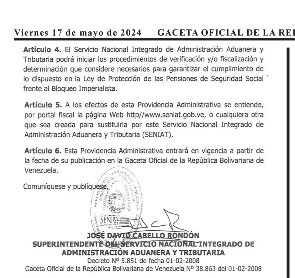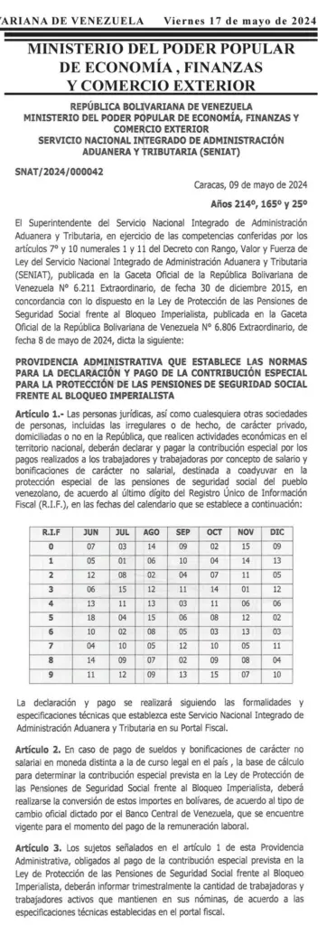 En la Gaceta Oficial número 42.881, de fecha 17 de mayo de 2024, el Servicio Nacional Integrado de Administración Aduanera y Tributaria (Seniat) publicó la resolución con las normas para la declaración y pago de la contribución especial para la Protección de las Pensiones de Seguridad Social frente al Bloqueo Imperialista.