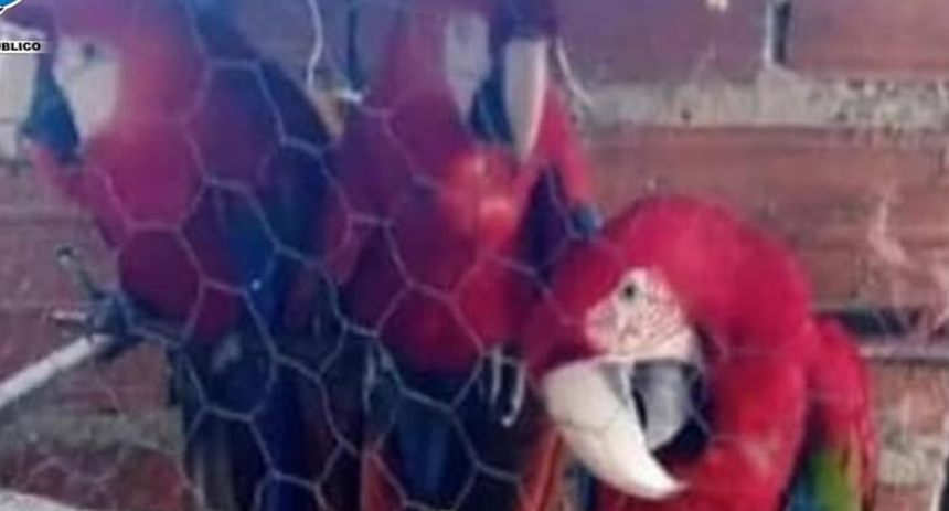 En la publicación del Ministerio Público aparecen las cuatro guacamayas, que vivían en una pequeña jaula en el interior de una casa.