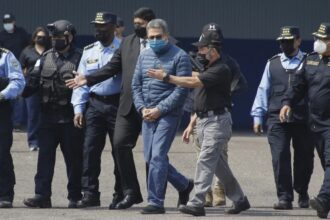 El expresidente de Honduras Juan Orlando Hernández, en el centro, con camisa azul y fuertemente escoltado por las…