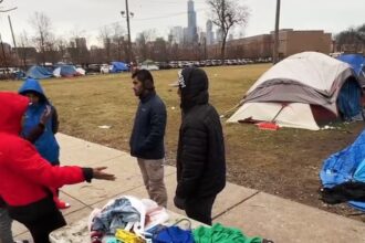 Un grupo de migrantes está en carpas, en un parque al lado de la estación policial del distrito…